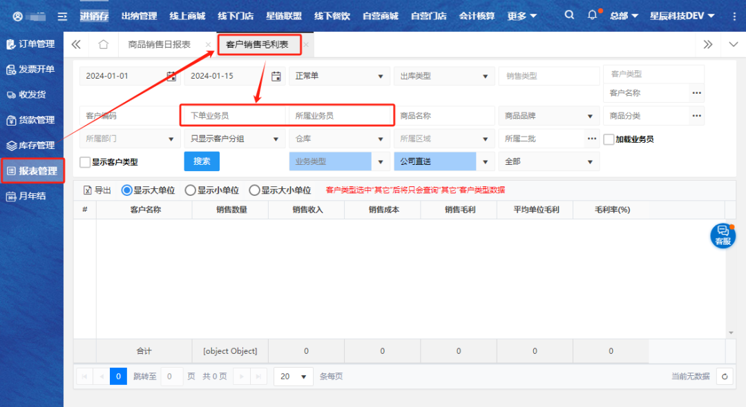 【进销存】-【报表管理】,所有类型的报表都支持根据“所属业务员”或“下单业务员”进行筛选查看,以“客户销售毛利表”为例。