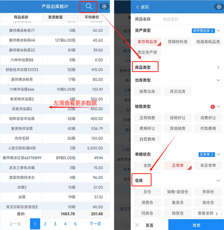 APP端查看:【应用模块】-【库存管理】-【出库统计】,向左滑动可查看各类数据,右上角“放大镜”可选择多种条件进行筛选查看,商品数据和仓库数据查看范围受该部门权限控制。
