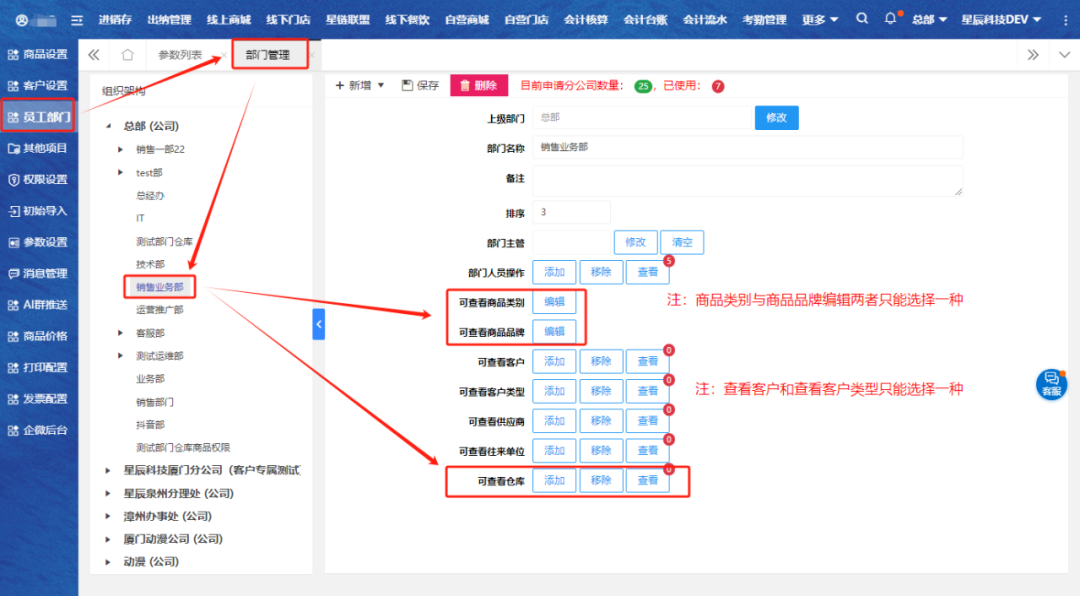 【系统管理】-【员工部门】-【部门管理】,可以选择需要设置权限的部门(例如“销售业务部”),设置商品和仓库查看权限,设置后该部门仅可查看权限范围内的商品数据和仓库数据。