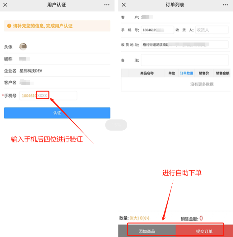 将临时二维码发送给客户进行微信扫码,输入客户手机后四位进行验证,即可绑定成功。客户可直接通过“自助下单链接”进行下单,无需花费多余的时间与业务员联系、沟通,下单更高效也更准确。