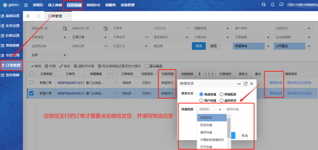 【自营商城】-【订单管理】-【订单管理】,因微信官方需要填写物流单号,为满足使用需求,新增发货信息接口。