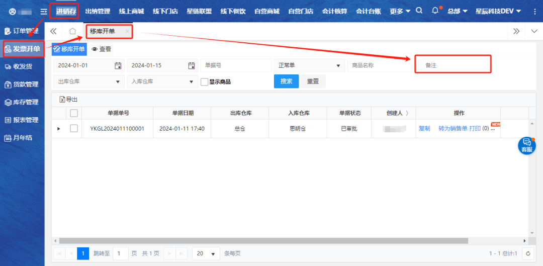 【进销存】-【发票开单】-【移库开单】,支持通过“备注”的内容进行筛选查看单据,方便通过备注信息搜索移库单据。