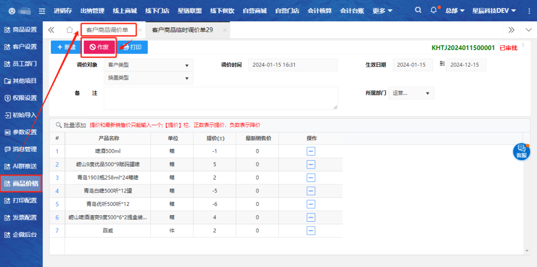 【系统管理】-【商品价格】-【客户商品调价单】,支持对未启用的商品调价单进行作废操作。