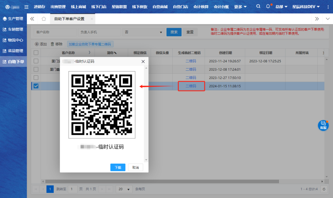 【辅助应用】-【自助下单】-【自助下单客户设置】,添加“客户”生成“临时二维码”。