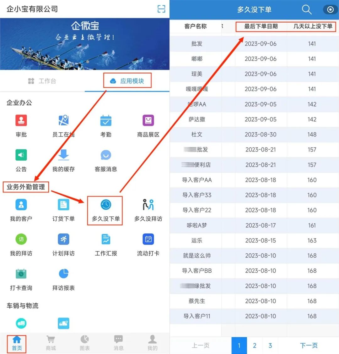 (2)【首页-应用模块-业务外勤管理-多久没下单】,可筛选查看客户几天以上没下单及最后下单日期。