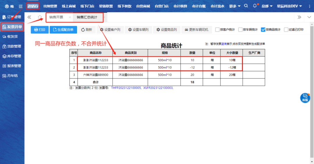 以销售汇总统计为例,【进销存-销售开票-销售汇总统计】,同一商品存在负数时,不会合并统计。