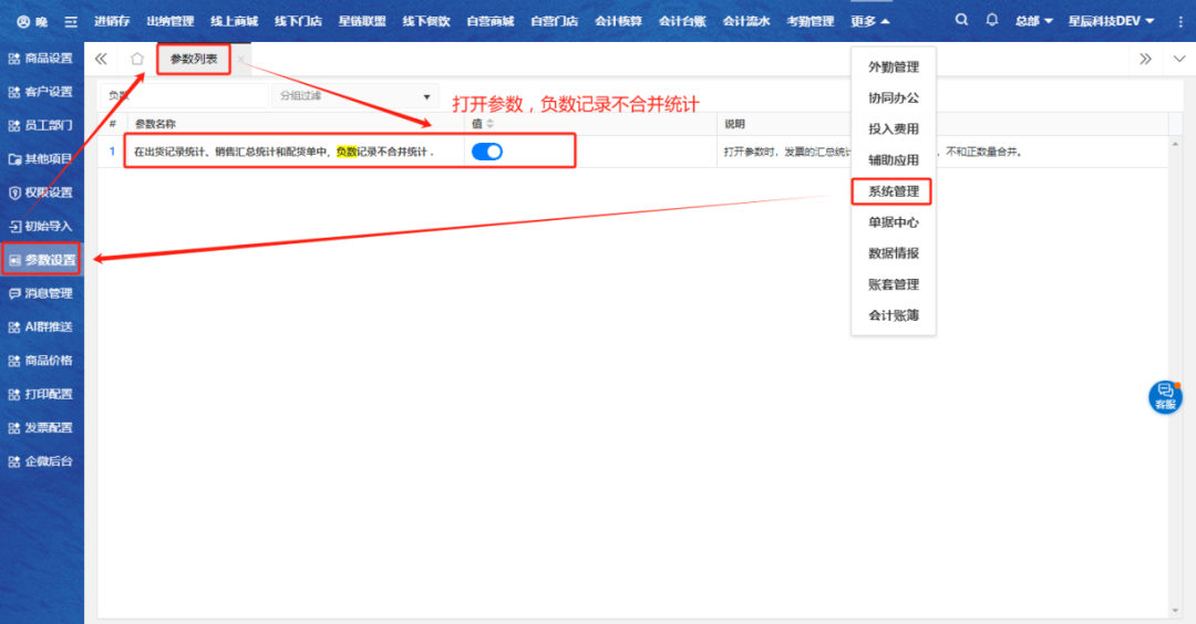 【系统管理-参数设置-参数列表】,查找“在出货记录统计、销售汇总统计和配货单中,负数记录不合并统计”并打开即可。