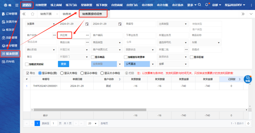 报表数据统计增加供应商查询条件,以销售票据明细表为例。