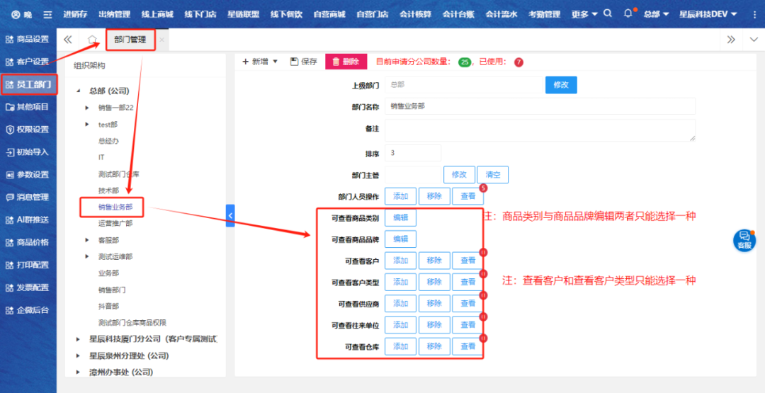 【系统管理-员工部门-部门管理】,可以选择需要设置权限的部门(例如“销售业务部”),设置客户、商品、品牌和仓库查看权限,设置后该部门仅可查看权限范围内的数据。