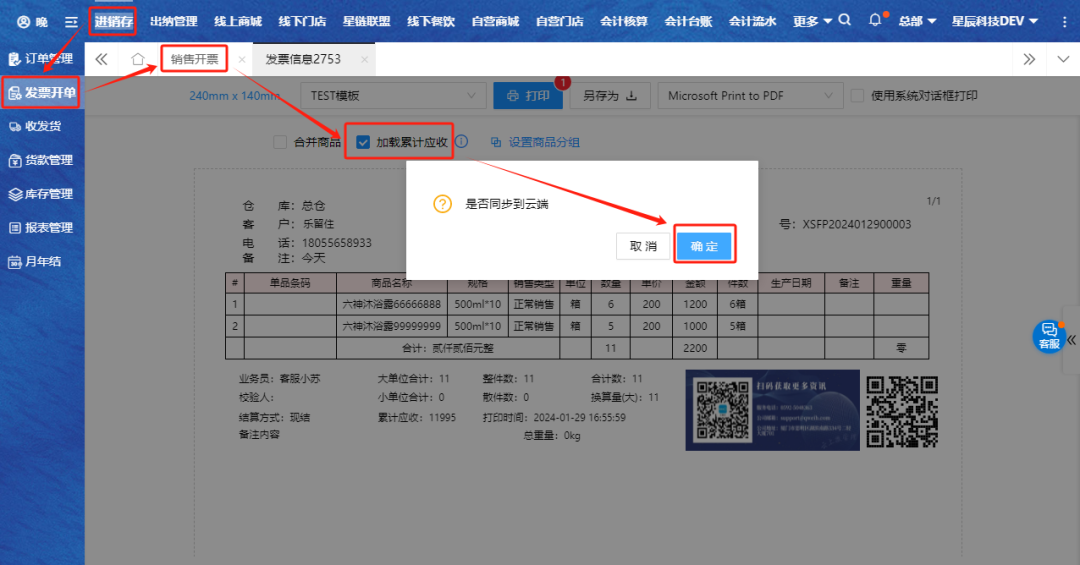 【进销存-发票开单-销售开票】,选择单据后点击“打印”,勾选“加载累计应收”并确定,可以同步配置到自动打印。