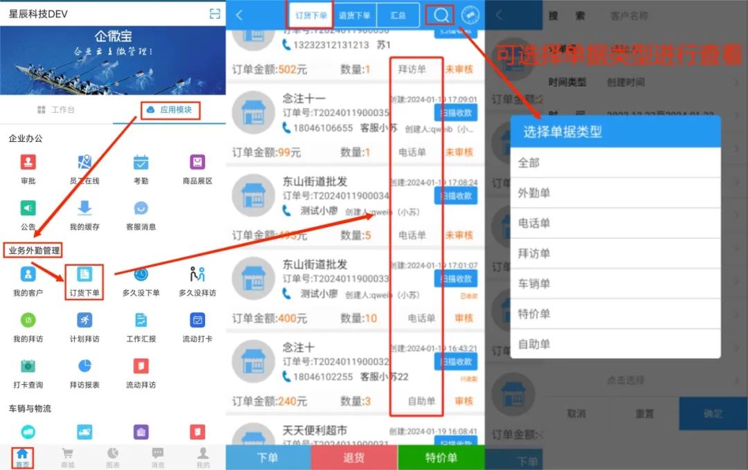 【首页-应用模块-业务外勤管理-订货下单】,查看单据时显示单据类型,查询条件也增加了对应的选项。