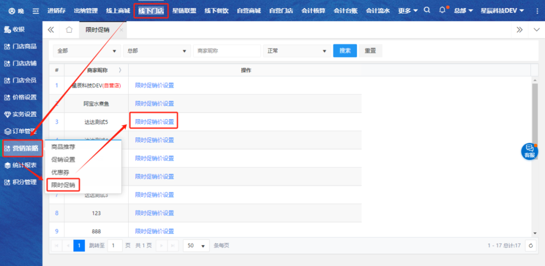 【线下门店-营销策略-限时促销】,可针对不同商家及商品进行限时促销价设置。