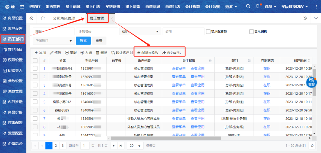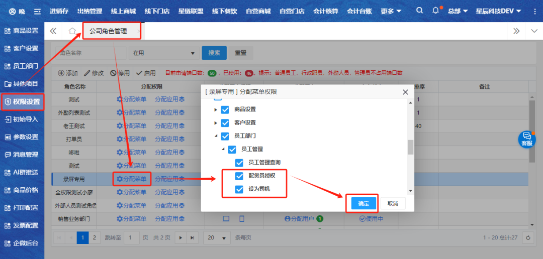 【系统管理-权限设置-公司角色管理】,选择角色并点击“分配菜单”,可以选择是否勾选司机/配货员权限按钮。
