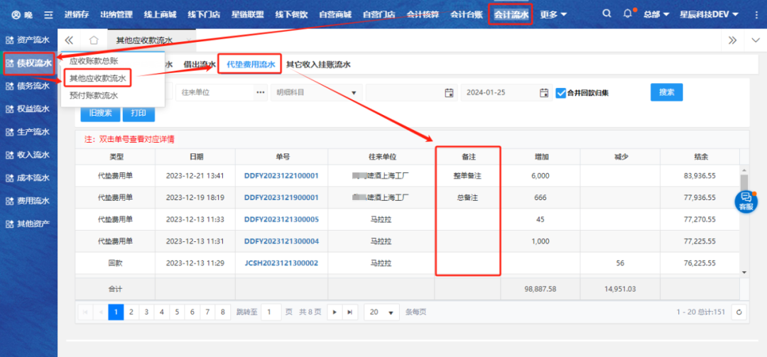 【会计流水-债权流水-其他应收款流水】,增加“备注”列可显示单据备注。