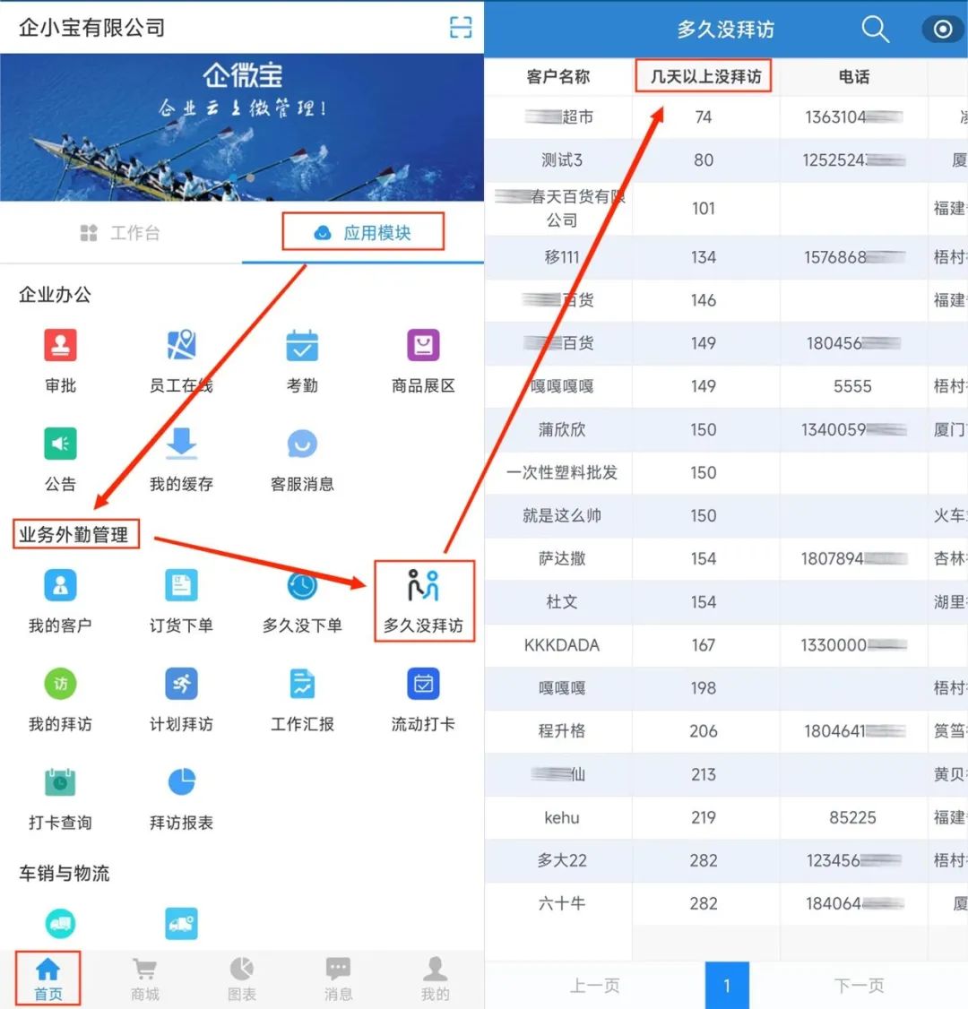 (1)【首页-应用模块-业务外勤管理-多久没拜访】,可筛选查看客户几天以上没拜访及最后拜访日期。