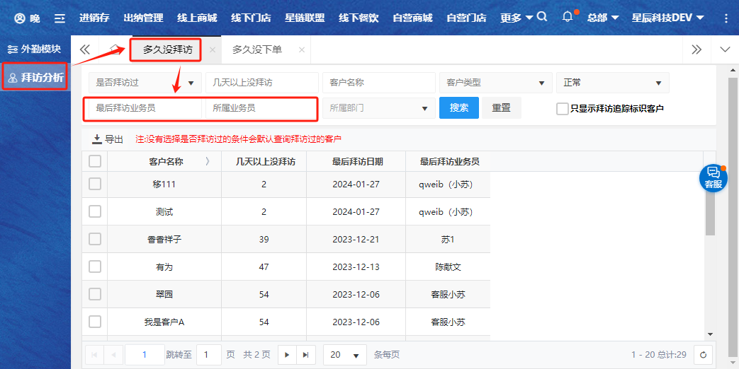 以电脑端多久没拜访为例,【外勤管理-拜访分析-多久没拜访】,业务员查询条件拆分为“所属业务员”&“最后拜访业务员”。