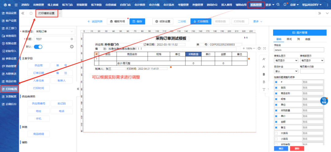 【系统管理-打印配置-打印模板设置】,选择“采购订单”进行编辑,可以根据实际业务需求进行调整。