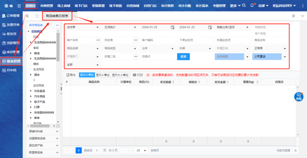 所有报表数据查看范围受该部门权限控制,以商品销售日报表为例。