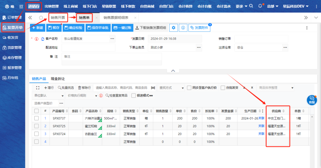 【进销存-发票开单-销售开票-销售开单】,添加商品时自动关联商品供应商。