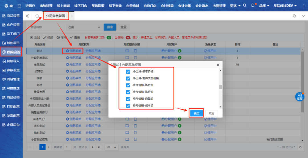 【系统管理-权限设置-公司角色管理】,可以针对不同员工角色的“参考价格”和“客户类型价”的权限进行细化控制。