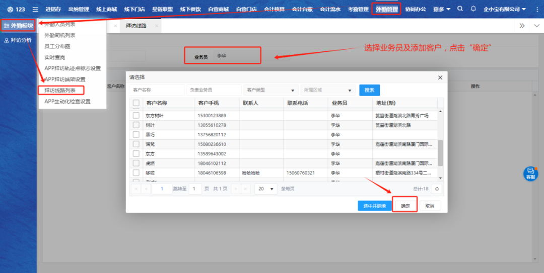 【外勤管理-外勤模块-拜访线路列表】,点击左上角“新增”进入拜访线路设置页面,选择业务员并添加客户,可以为业务员设置拜访线路。