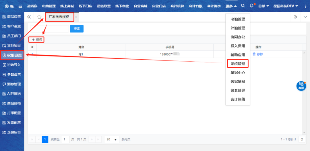 【系统管理-权限设置-厂家代表授权】,点击左上角“授权”新增人员,该人员仅可查看报表统计数据,无法双击查看报表明细。