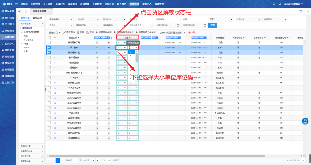 展示货区一栏,点击货区解锁状态栏。下拉对应商品选择大小单位库位码。