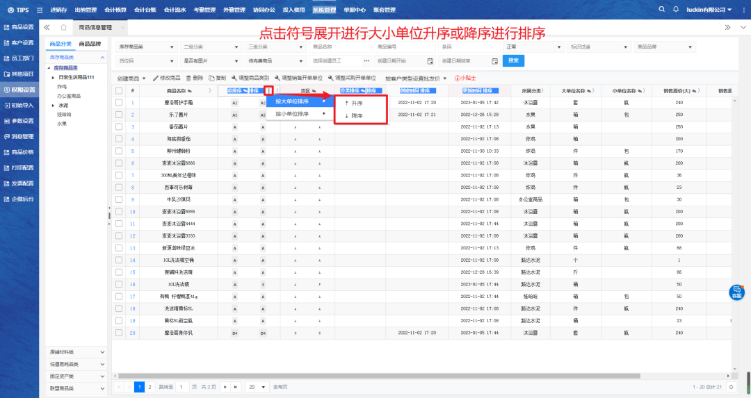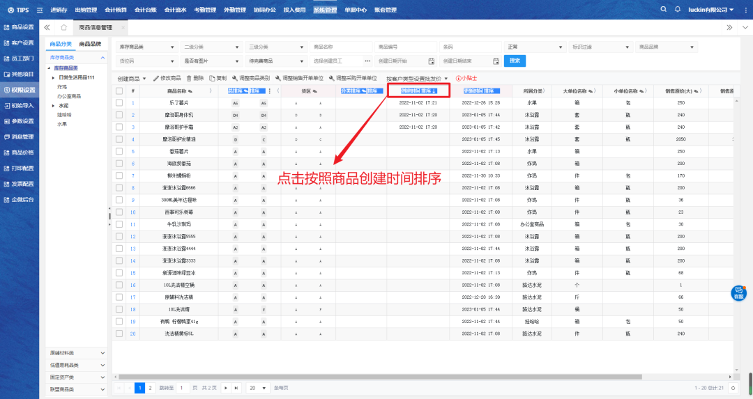 一、点击总排序一栏的展开符号,点击创建时间一栏排序箭头,“↑”或“↓”即商品按升序或降序进行排序。