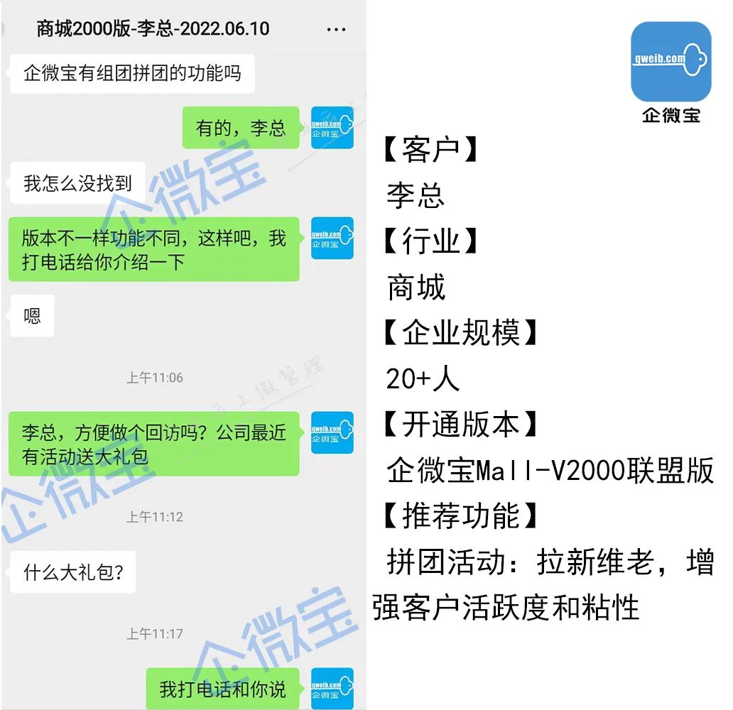 我越想越觉得应该弄一个拼团活动,联系了企微宝的业务员,在我商城新增了拼团活动功能。最开始参加活动的还是老客户,不过慢慢地,之前流失的客户也回来了而且增加了不少新用户。我就感觉我的商城好像又迈入一个新台阶了,企微宝这个拼团活动啊,让我的商城活起来了。