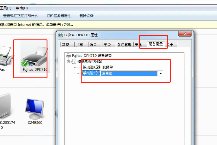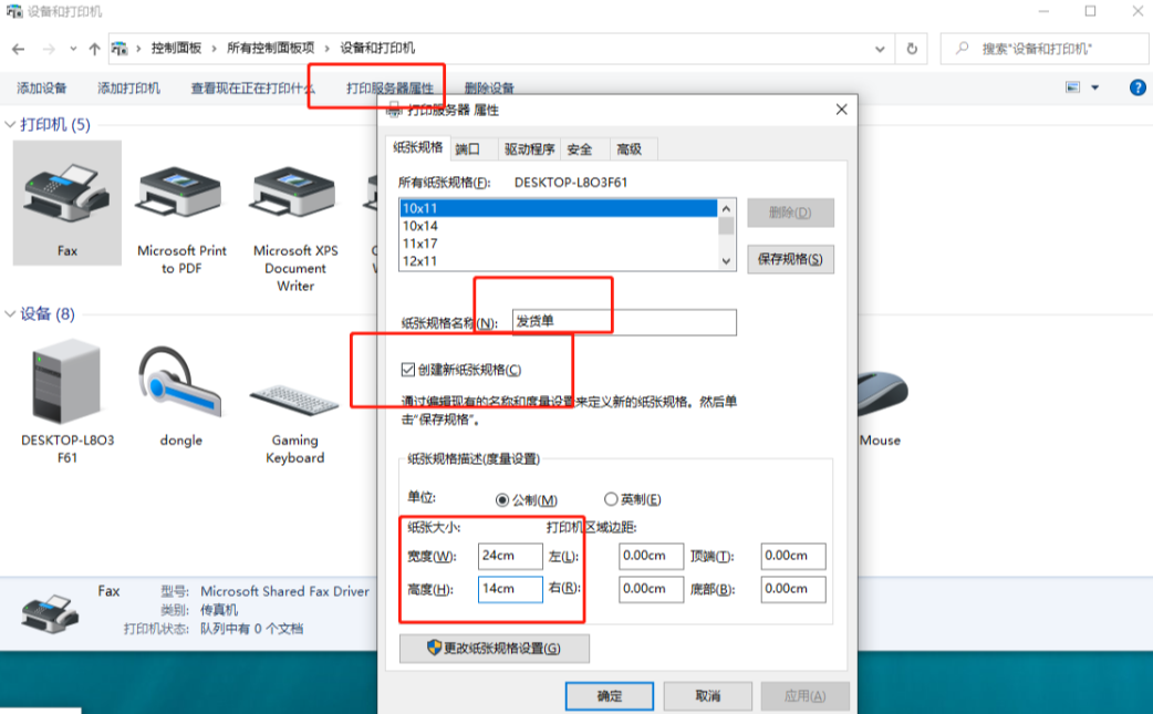 一、选中连接的打印机,点击打印服务器属性,☑勾选创建新纸张规格,输入纸张规格名称发货单,宽度22,高度14