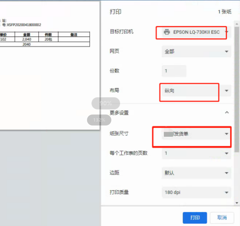 二、在系统发票信息页面点击打印后到打印预览页面点击更多设置,展开后,找到纸张尺寸,下拉选择刚刚创建的纸张;