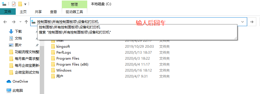 【操作路径】打开计算机c盘,输入:控制面板\所有控制面板项\设备和打印机