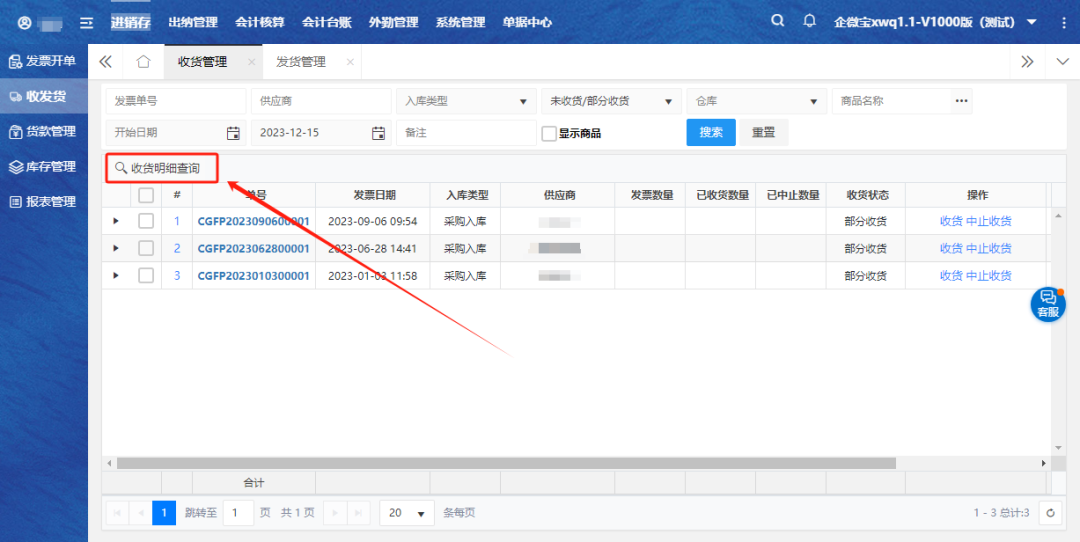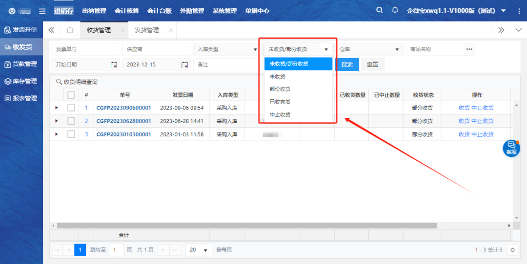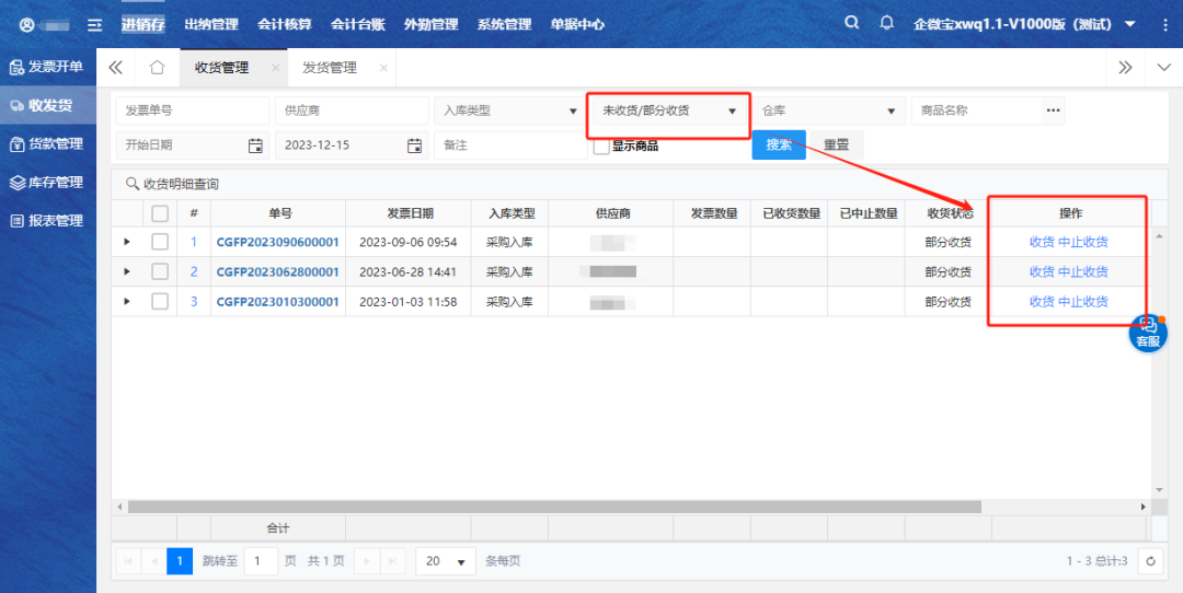 二、未收货/部分收货的单据可以进行收货或中止收货的操作。