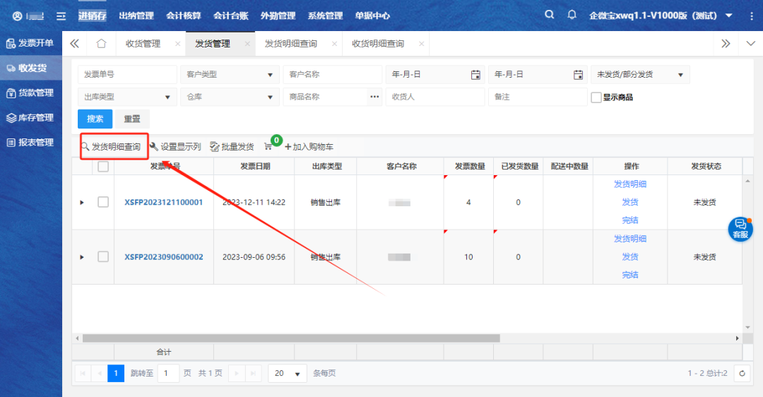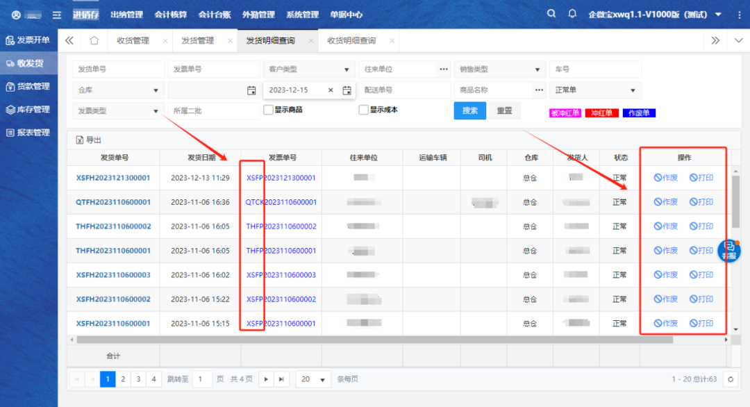 点击发货明细查询,可查看具体信息,进行作废或打印操作。