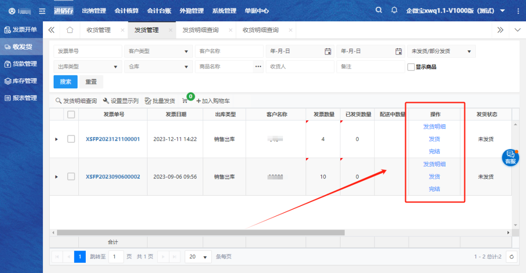 二、未发货/部分发货的单据可以进行发货的相关操作。