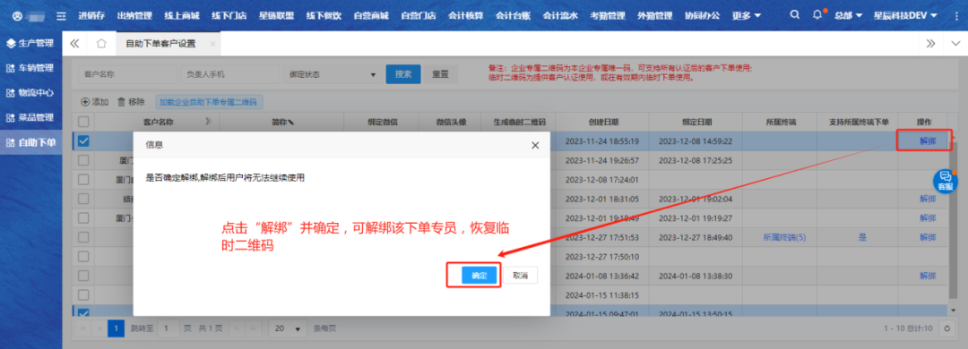二、点击“解绑”可解绑该下单专员,恢复临时二维码,可重新绑定下单专员。