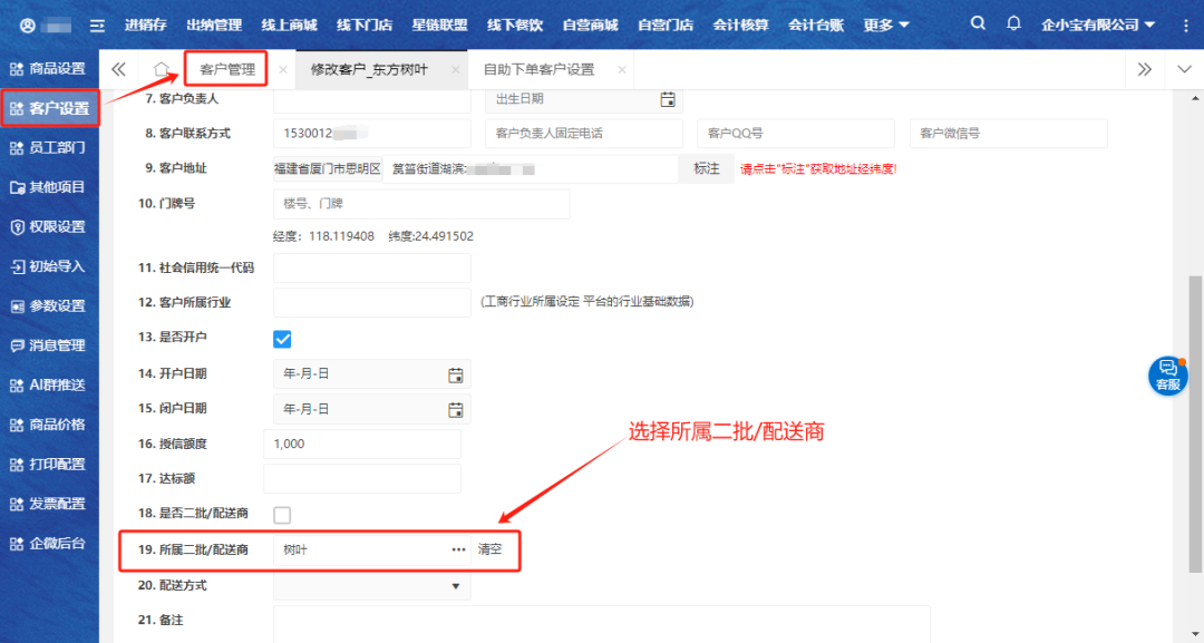 一、【系统管理】-【客户设置】-【客户管理】-点击客户名称,进行“所属二批/配送商”设置。