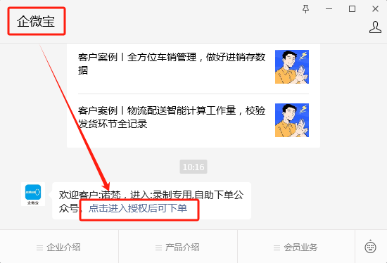 打开微信“扫一扫”进行扫码,自动跳转至企微宝公众号(需关注),进入弹出的“点击进入授权后可下单”链接中(注:绑定成功后,重新点击该链接将会直接进入下单页面)。