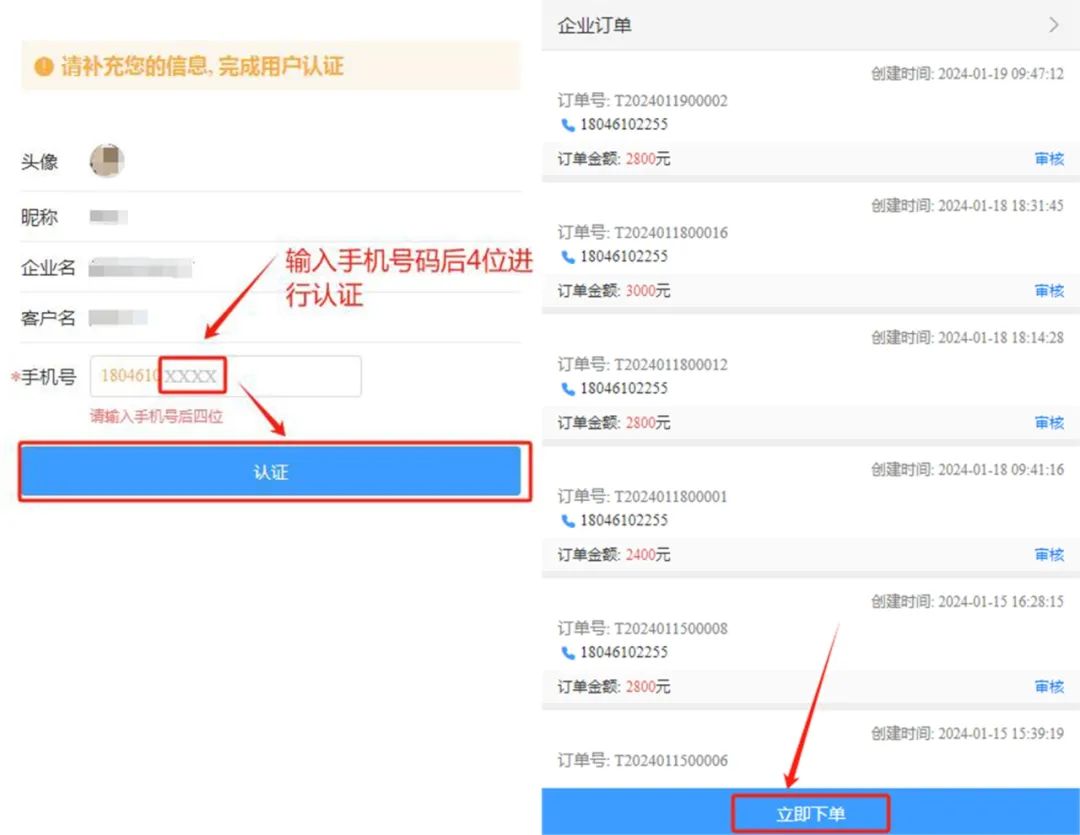 输入客户手机后四位进行“认证”,即可绑定成功并自动跳转至下单页面。