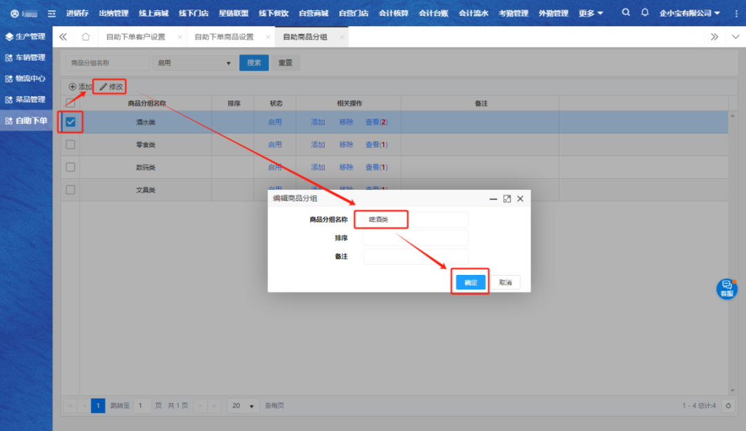 二、勾选商品分组,点击“修改”,则可以修改商品分组名称、排序、备注等信息。
