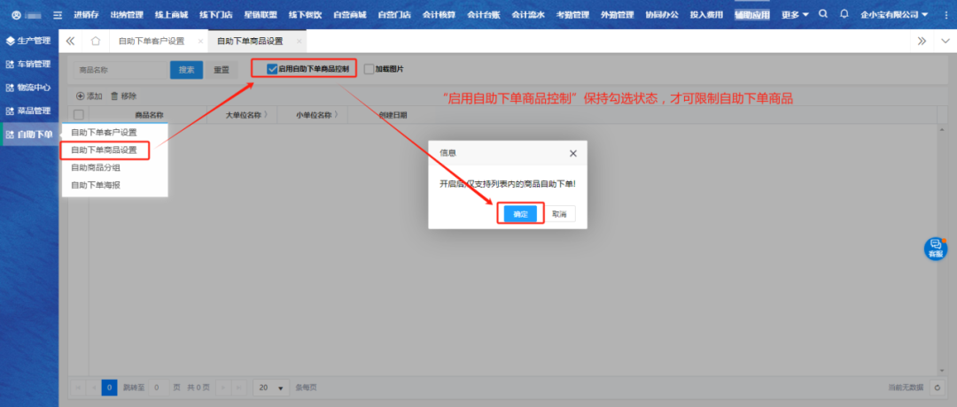 一、“启用自助下单商品控制”保持勾选状态(注:关闭后,公司所有正常商品都支持自助下单选择)。