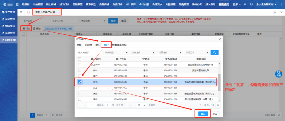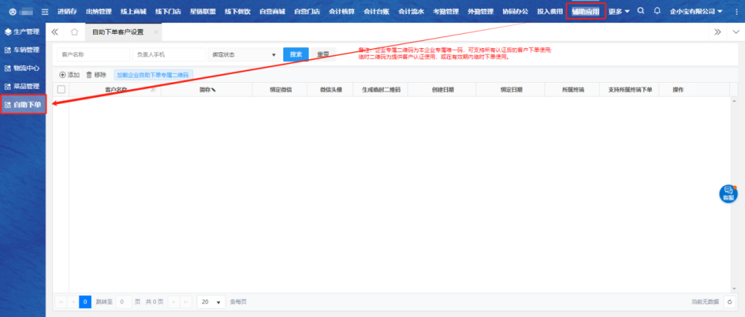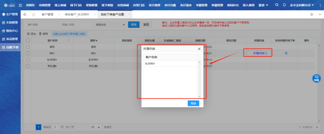 二、回到【辅助应用】-【自助下单】-【自助下单客户设置】,可查看所属终端(注:“支持所属终端下单”选择“是”)。