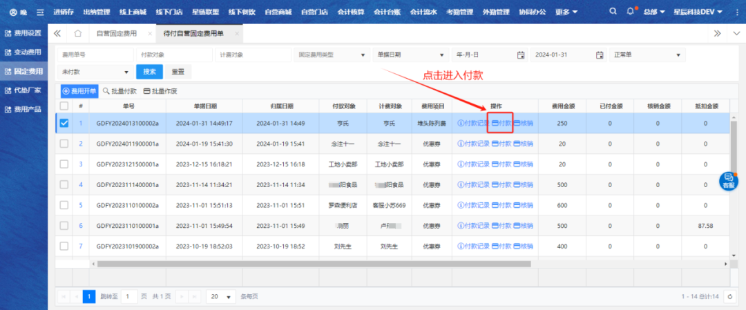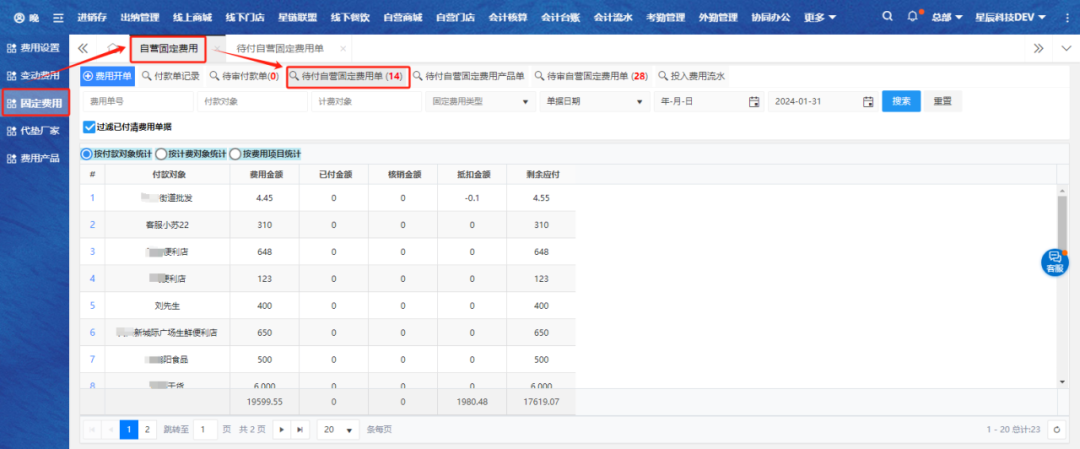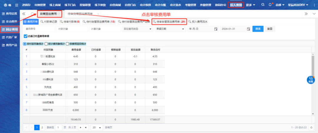 二、【投入费用-固定费用-自营固定费用】,点击“待付自营固定费用单”。