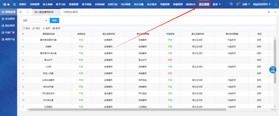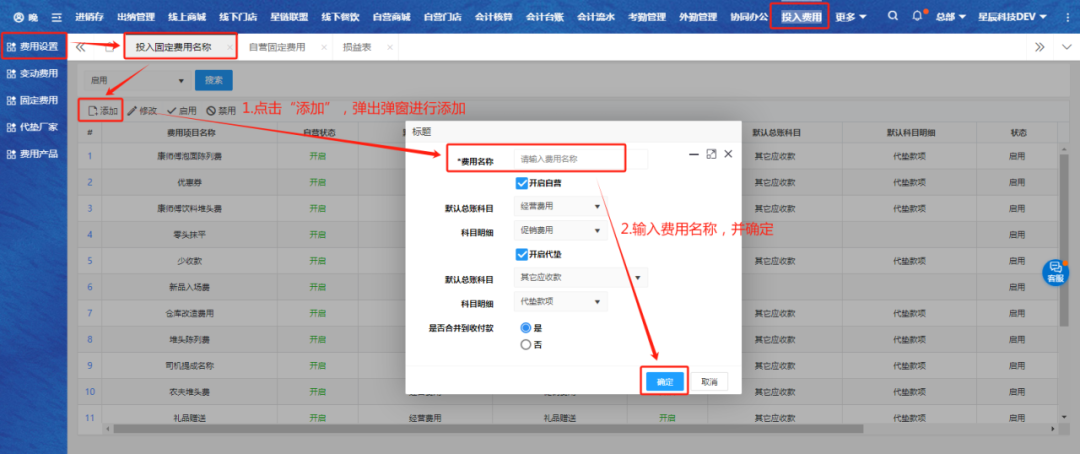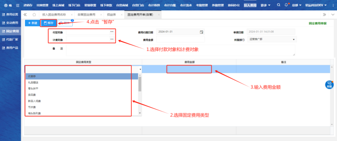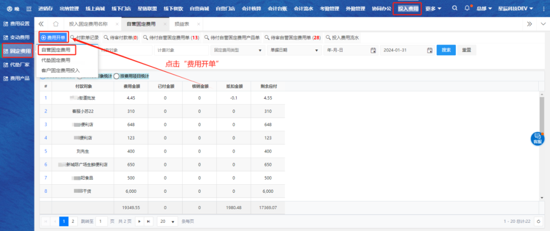 【投入费用-固定费用-自营固定费用】,点击左上角“费用开单”进行开单。