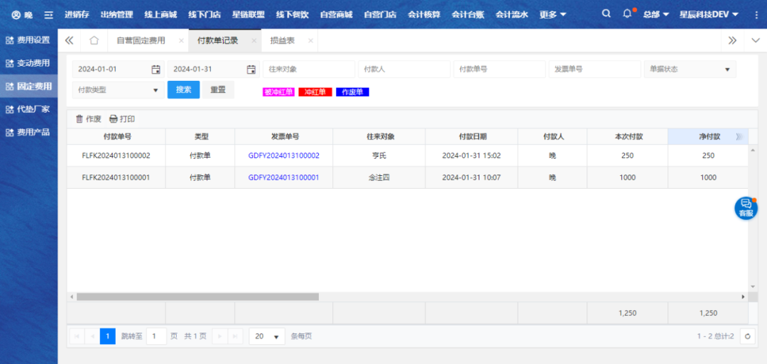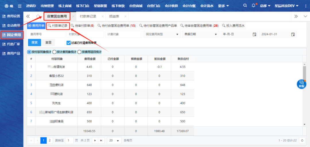 三、【投入费用-固定费用-自营固定费用】,点击“付款单记录”进行查看。