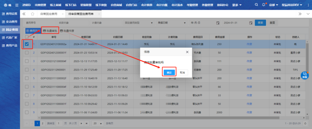 一、【投入费用-固定费用-自营固定费用】,点击“待审自营固定费用单”。
