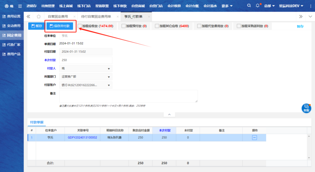 选择付款对象和计费对象、固定费用类型,输入费用金额,点击“暂存”。