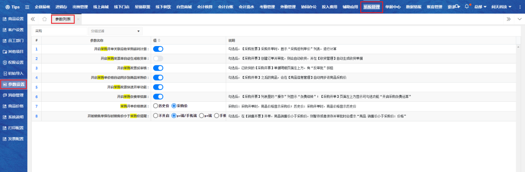 企微宝的参数设置模块,可以在允许的范围内对正在使用的系统参数进行调整,开启采购单价格自动同步到商品采购件。