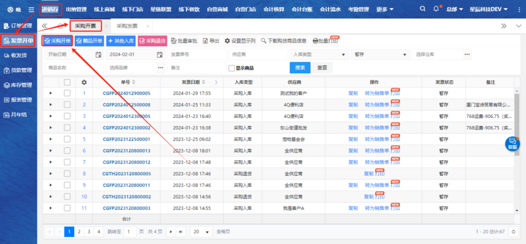 【进销存-发票开单-采购开票】,点击“采购开单”进入页面。