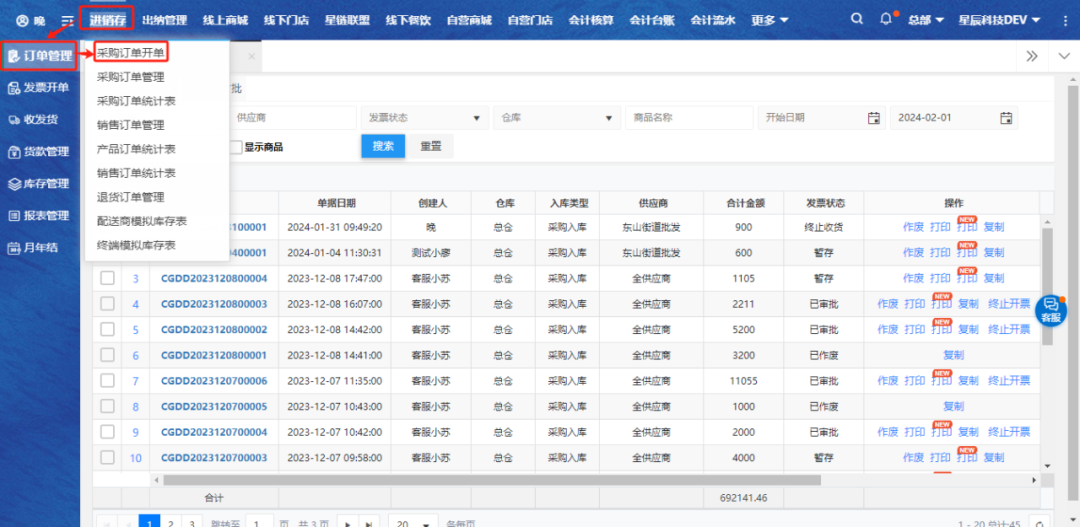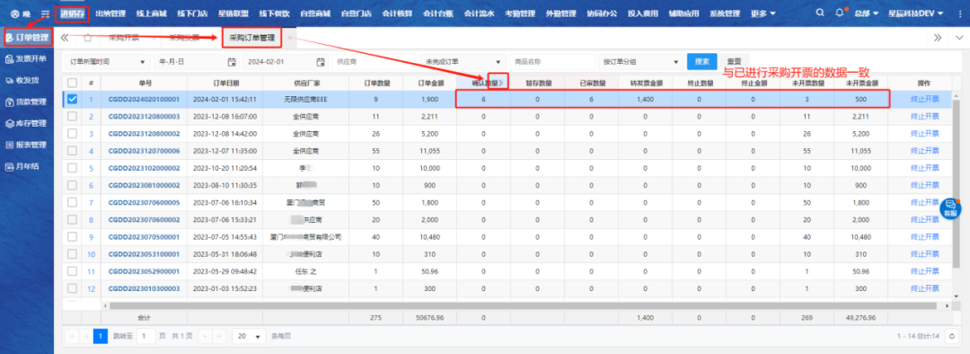 采购订单开单在一定程度上类似于创建采购计划,在采购开票时可以选择采购订单进行转票,实现快速开票,同时支持分批采购,按照实际采购情况进行采购开票或按照商品实际送达数目进行采购开票。